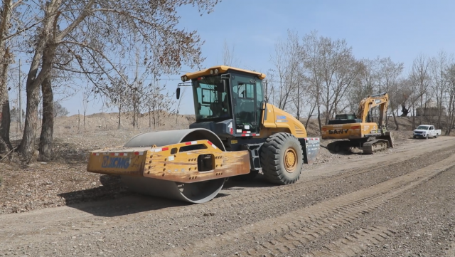 走进施工现场,压路机轰隆作响来回碾压路面,推土机挥舞铲斗平整路基,技术人员则手持测量仪器细致校准道路宽度,一派热火朝天的施工景象。